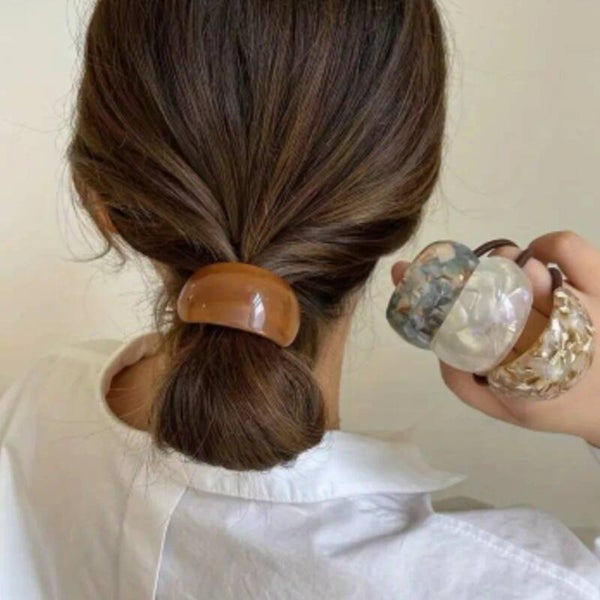 Dank des stabilen, elastischen Haargummis sitzt dein Haar den ganzen Tag zuverlässig. Die hochwertige Acrylplatte sorgt für einen edlen Glanz.